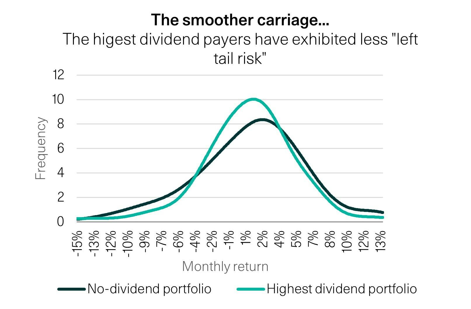 Despite a slightly bumpier ride (figure 2 draws out the distribution of monthly returns, which demonstrates dividend paying stocks exhibit slightly more left-tail risk or a greater predisposition to steep share-price declines) zero-dividend-paying stocks have also been a better way of funding spending.