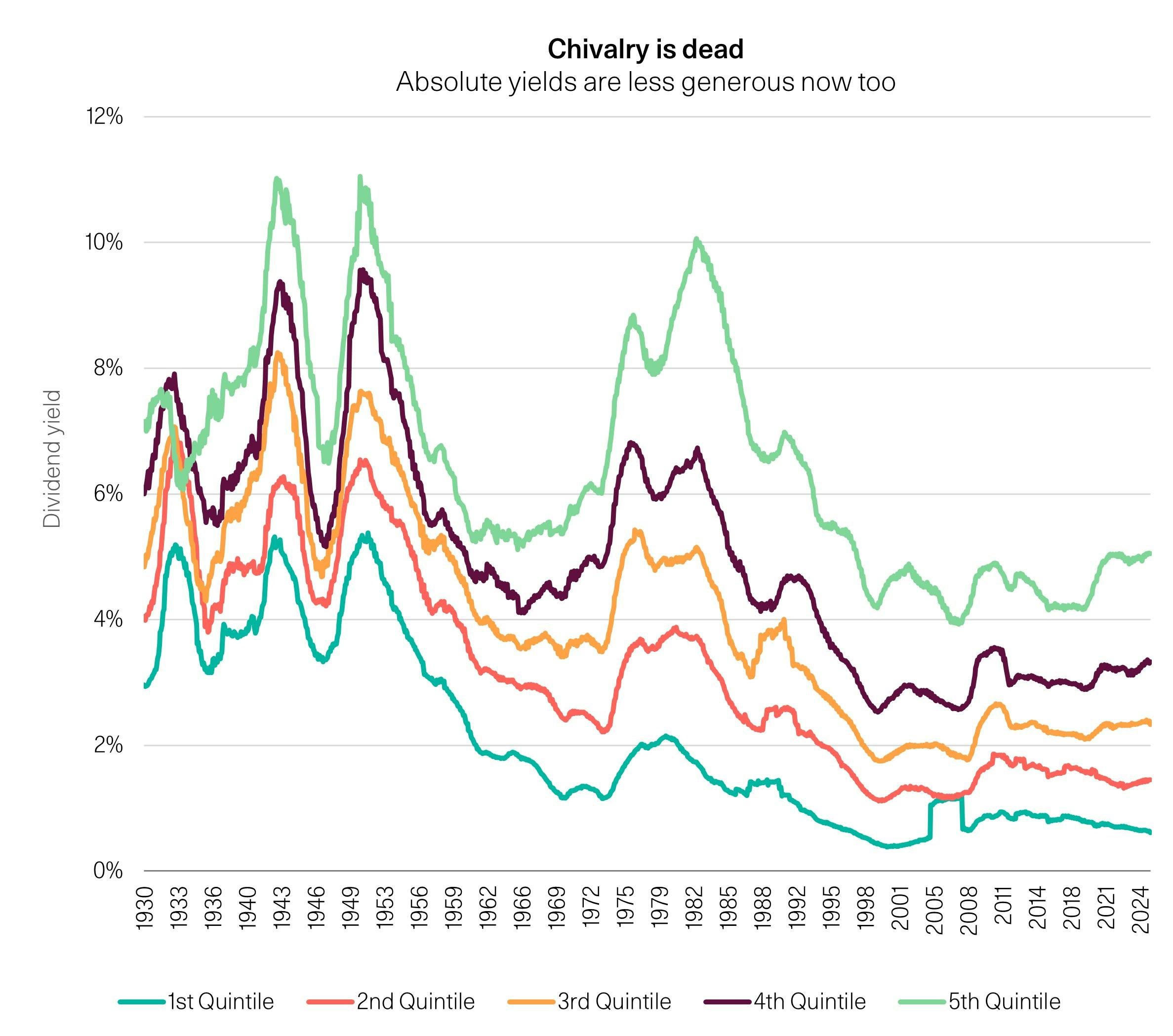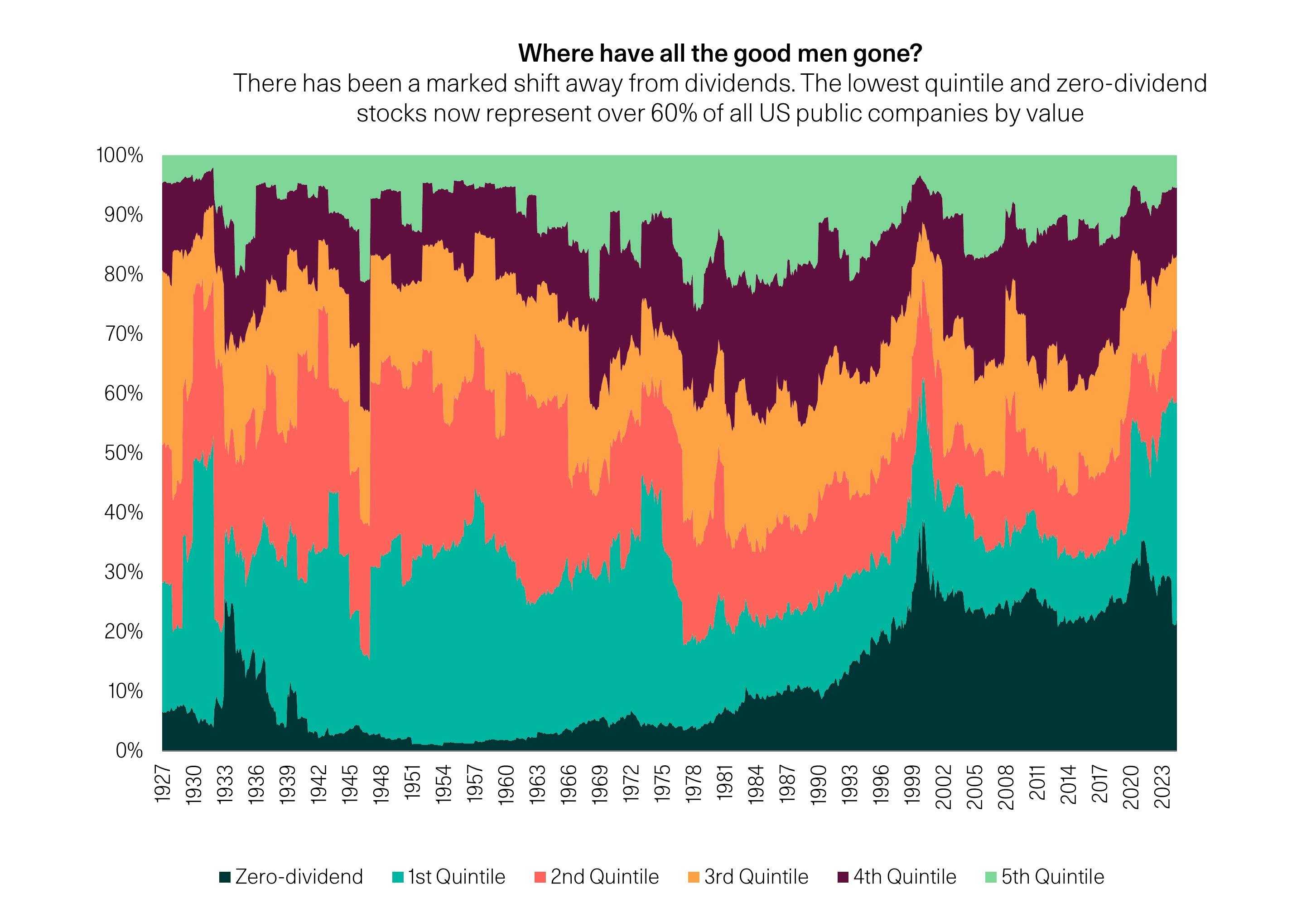 The shift in market composition towards low and zero-dividend stocks is obvious and significant; the lowest quintile and zero-dividend stocks now represent over 60% of all US public companies by value. We also go one step further and examine the shift in category definitions (what yield earns you the esteem of being the highest payer). Notably, a representative 3% dividend stock would have sat in the 1st quintile (lowest paying) in the 1930s (well over 80% of the universe by market cap would pay dividends in excess). Today we’d be looking around the 4th; our universe of suitors is less than 20% of US public companies by market value. Where have all the good men gone?