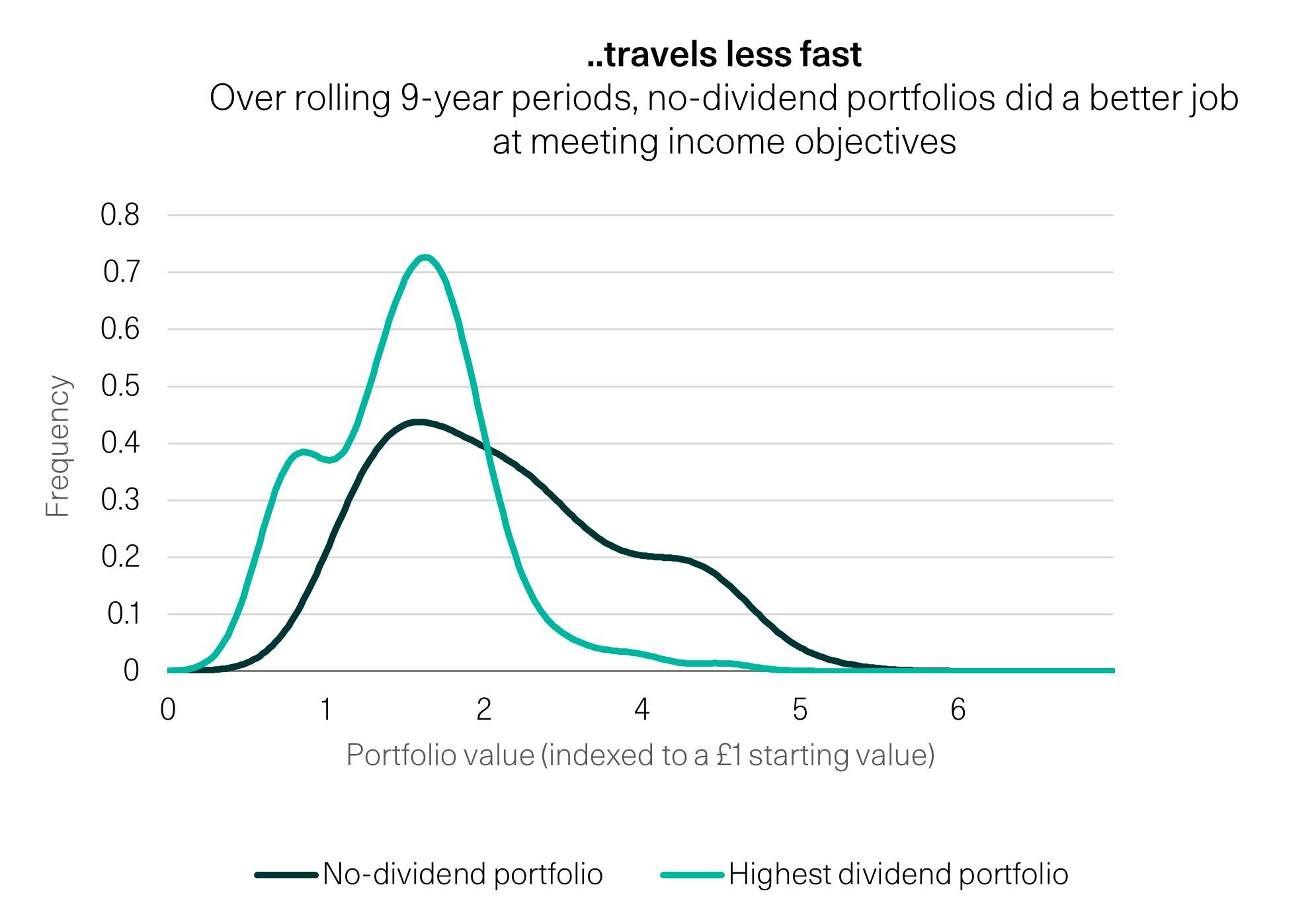 Examining the distribution of rolling nine-year (a healthy trustee tenure) portfolio value outcomes, and assuming a four-pence spend for every pound starting value, reverses the previous pattern. Higher-dividend-paying portfolios now exhibit more left-tail risk (a greater predisposition to lower, and negative, portfolio values). An attempt to smooth income provision producing the stability of a graveyard.