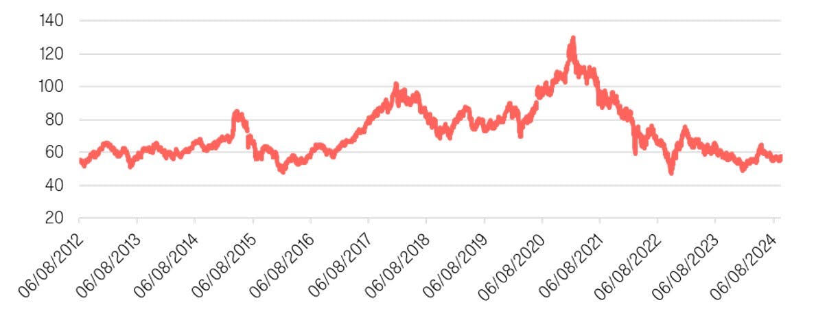 Investment capital has retrenched from China. Foreigners have been net sellers of equities to the extent that “ex-China” asset classes have emerged. Capital raising activity has also dried up with primary equity raises on the Hong Kong Exchange falling from HK$331.4bn in 2021 to HK$46.3bn in 2023. This investor exodus and the extreme of negative sentiment has caused a derating of the equity market to historic lows.