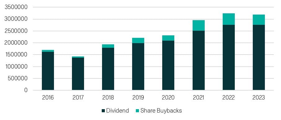 The government’s pervasive involvement in industries (through regulation, SOEs and subsidised capital) often serves to subordinate shareholders’ interests in China. But following in the footsteps of Japan’s shareholder reorientation, the Chinese regulator has introduced guidance and incentives for companies to prioritise return on equity and share price performance. For the government, this encourages greater capital efficiency among SOEs at a time when the fiscal position has become increasingly constrained. These reforms are bearing fruit with total distributions to shareholders doubling since 2016, and with share buybacks in 2024 showing further growth.