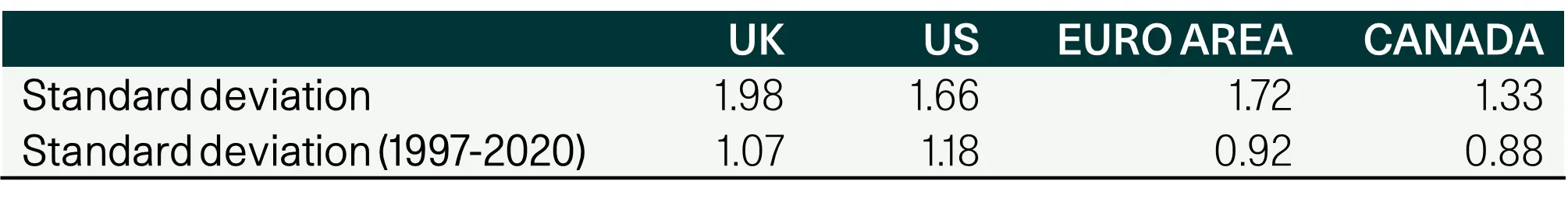 Looking at the upper tail of inflation outcomes reinforces the same conclusion. The UK does show slightly larger deviations from its own average during extreme shocks. However, the differences are modest. Prior to the pandemic, US inflation actually exhibited larger extreme moves, while Canada and the euro area remain structurally more stable.