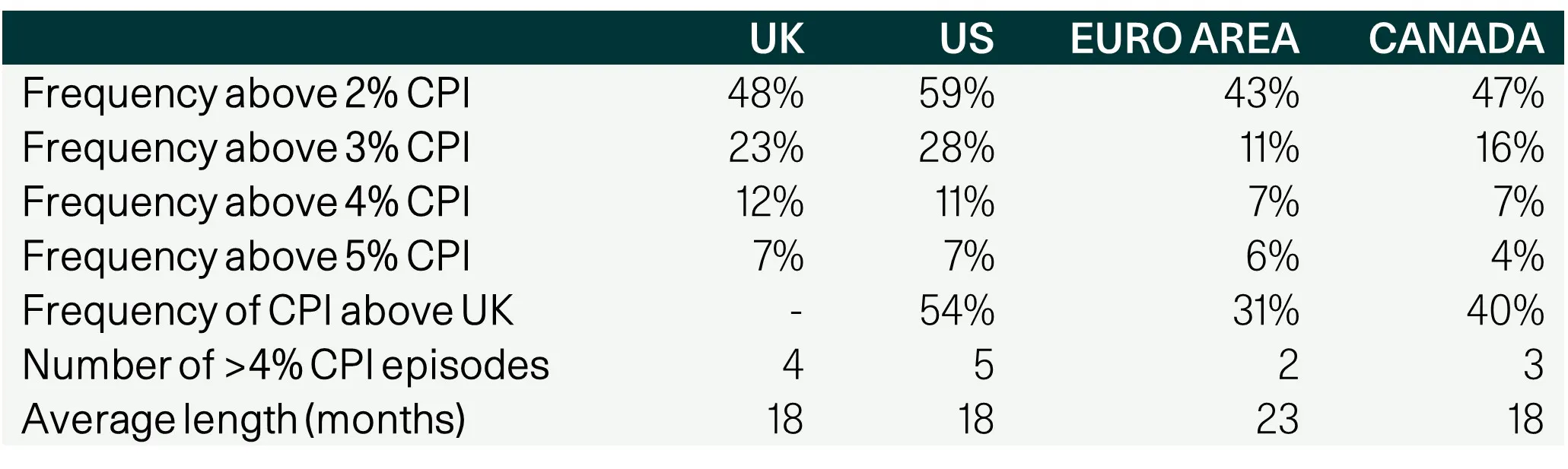 Just as importantly, high inflation episodes in the UK have not lasted longer than elsewhere. Average durations of periods above 4% are broadly comparable too.