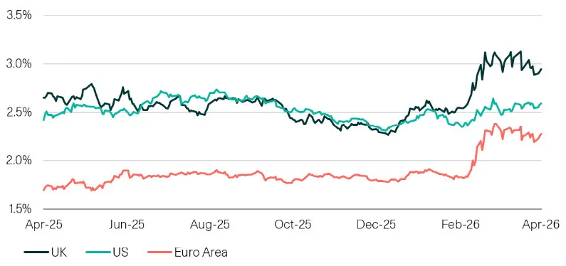 This stands in contrast to economist consensus, which expects UK inflation to return towards target and, over the medium term, to be lower than in the US. Historically, UK inflation swaps have been broadly unbiased versus realised inflation, while US and euro area pricing has tended to undershoot. This suggests a degree of pessimism embedded in UK inflation markets, potentially reflecting recency bias following the sharper UK inflation overshoot in the latest cycle.