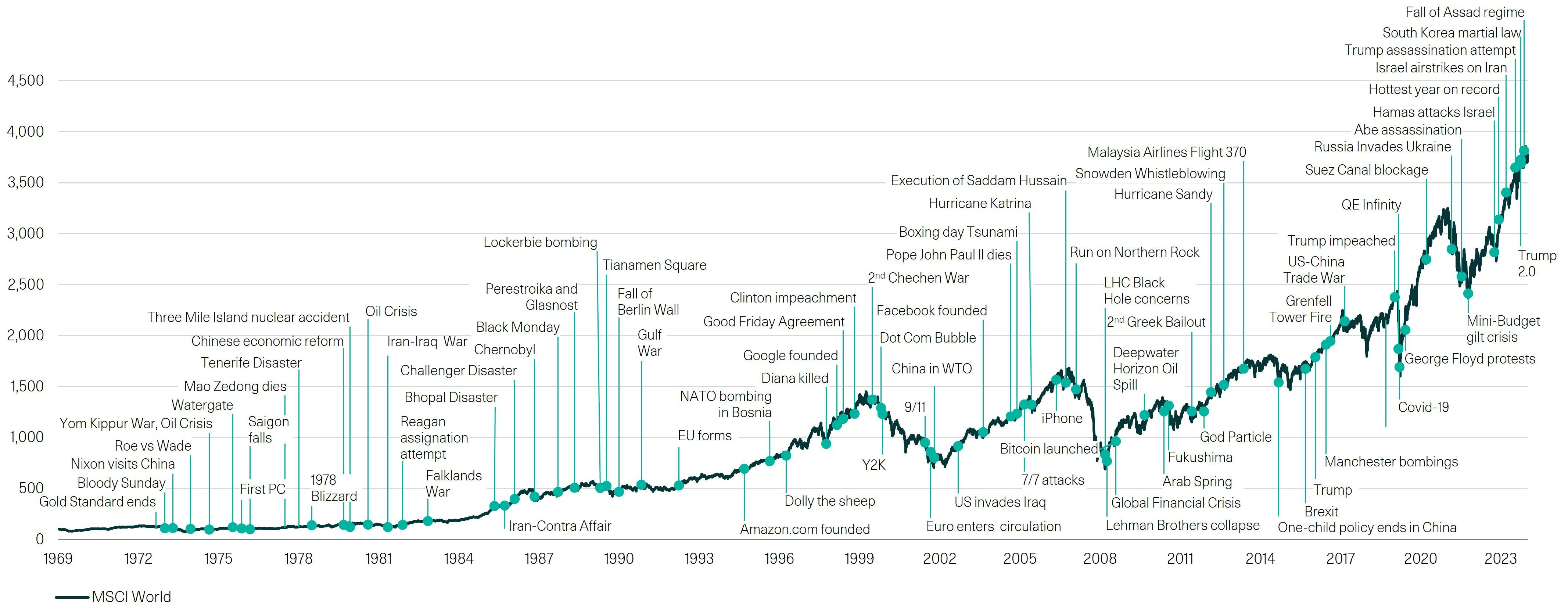 There are always reasons not to invest and very few people have brilliant market timing which enables them to sell at the top and buy at the bottom. Unfortunately, “going to cash” can lead to buying back equities at higher prices. For the long term investor, the key question is not about trying to time the market but how to, diversify. At W1M we do not believe that buying every stock in the world is the best way to diversify in equities, especially when a handful of stocks now dominate even large indices like the S&P 500. An active equity portfolio with around fifty stocks could easily have less “AI” related tech exposure than an index fund bought perhaps in the expectation of it being more diversified given many more holdings. We believe that, in addition to diversification, adding “protection strategies” is useful in just the same way as most house owners take out some insurance to mitigate losses in extreme events. Not everyone has such strategies. Fixed income positioning can add to the defensiveness of a portfolio and holding real assets can give inflation resilience and good returns for the long term investor.