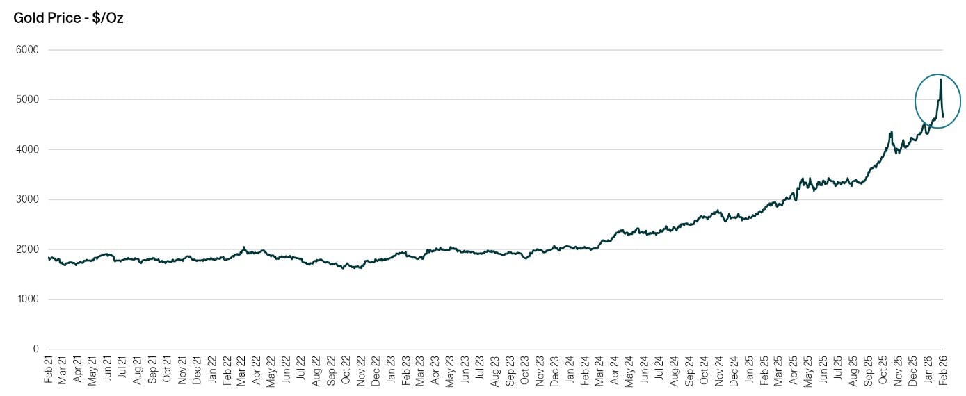 We have written recently about our commodity and gold exposures giving investors improved diversification and inflation resilience (Can commodities be an antidote to geopolitical anxiety?). Precious metals have had a very strong few months; now, there has been, a not totally unexpected, correction with the spot gold price dropping more than 9% in a single session, marking one of its steepest declines in decades. Can you see it on the 5 year graph below? We like to keep corrections in context but that does not mean we ignore them; we are active investors.