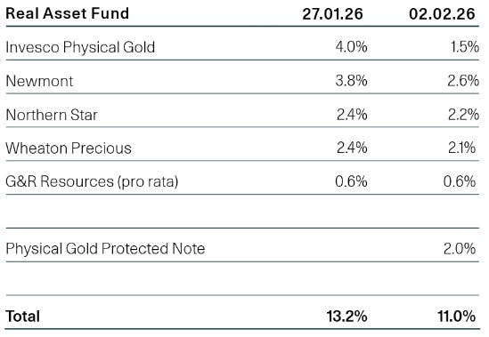 In January, we reduced our exposure to precious metals, including platinum and gold. We took profits in gold mining stocks (like Newmont) which have done incredibly well over the last 12 months and also sold around half of our physical gold exposure in our Real Assets Fund (and across the W1M multi asset funds) to buy a defensive capital protected note on physical gold. The note was structured to participate in a further 22.15% rise in the gold price from strike ($5,076) but provide a beta of ~0.5 to any downside move, in conjunction with being 90% capital protected on a 12 month view. The table below shows that our Real Assets Fund has, between 27.1.26 and 02.02.26, reduced its gold exposure from around 13% to 11%. This shows our constructive long-term view on gold as well as active investment management prudently taking profits and managing risk.