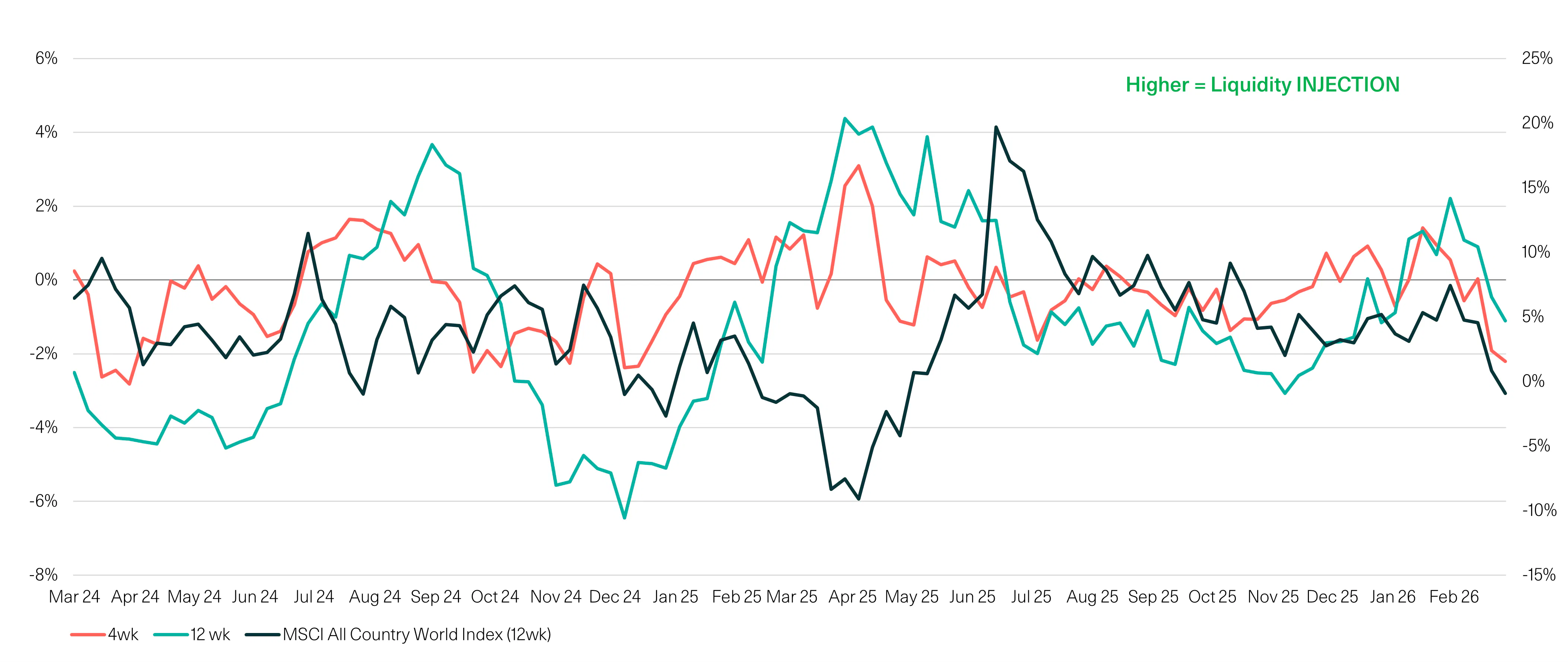 Reduced Liquidity Support: 4 & 12 week change in Central Bank Balance Sheets & 12 week change in Global Equities