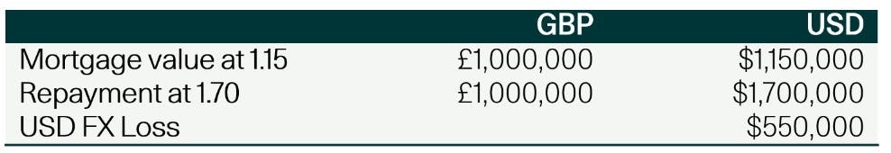 If the above scenario is reversed, i.e., initial mortgage of £1m was taken out at a GBP/USD rate of 1.15 and later repaid at 1.70, the $550,000 ‘phantom loss’ in this instance, is viewed by the IRS as a ‘personal loss’ and as such, not deductible.