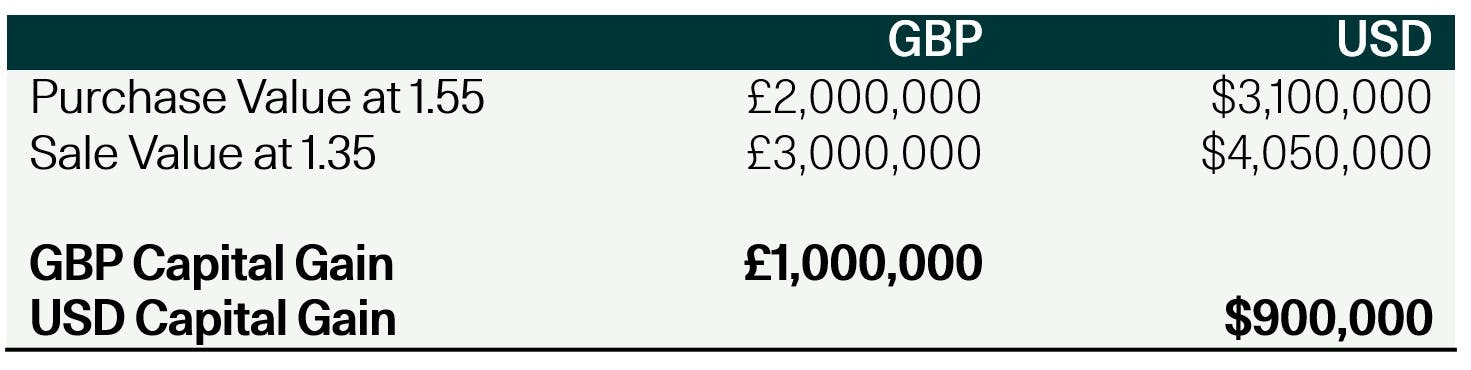 Although the GBP has depreciated against the USD in the above scenario, due to the UK’s Private Residence Relief, no capital gains will be due from HMRC’s perspective. Whilst there has been some depreciation in the currency from 1.55 to 1.35, there is still a USD capital gain of $900,000. After deducting the $250,000 primary residency exclusion, there is still a taxable long-term capital gain of $650,000 for US purposes.