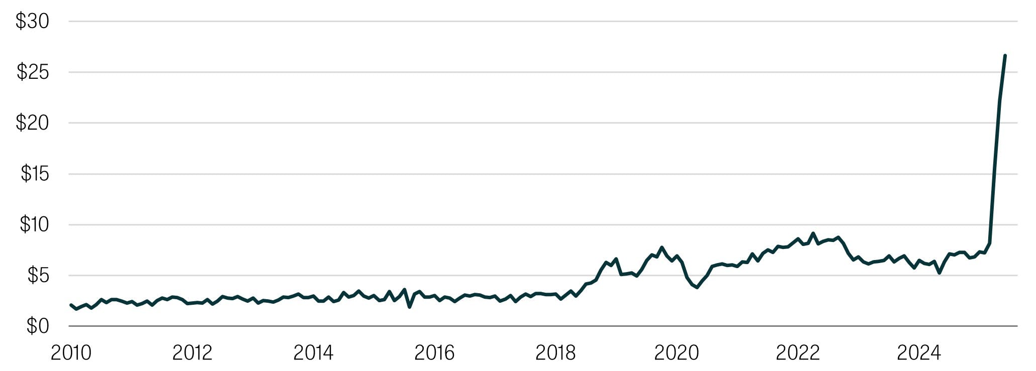 US Customs Duties Revenues, US$ billion, 2010-2025 monthly