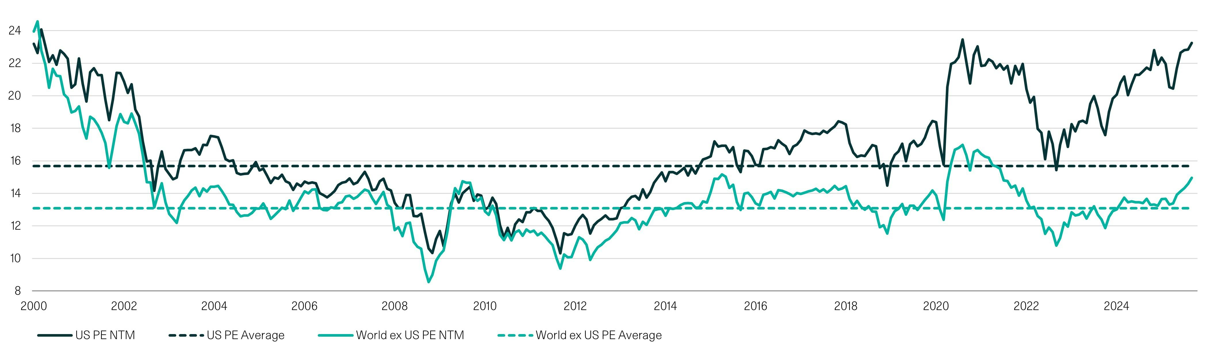 MSCI US and MSCI Global ex US price–earnings ratio based on next 12 months earnings