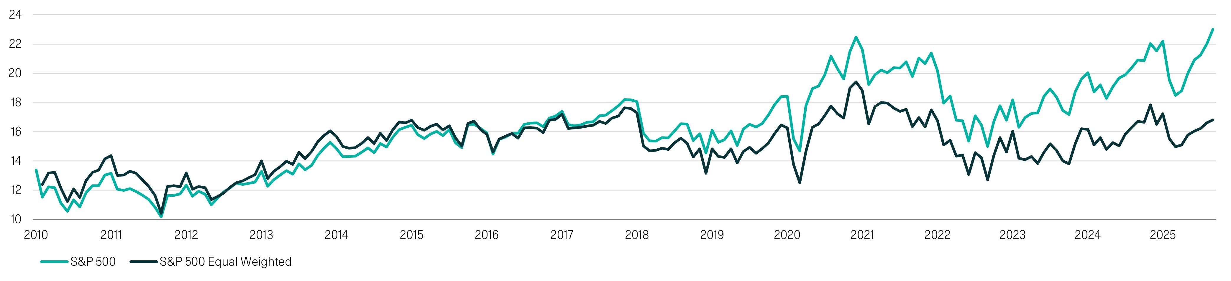 S&P500 Index and S&P500 Equal Weighted Index, price earnings ratio 2010 - current