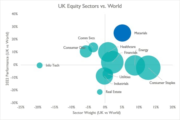 There are a number of elements to consider when making a comparison between different markets, these include the quality of the companies that are listed in the country, the size and liquidity of those companies (i.e. can they be bought/sold quickly and easily), and the industries in which they operate. These can be considered relative to other markets or to the global index. The chart below illustrates this. The chart shows each of the 11 MSCI sectors (the bubbles are proportional in size to the weighting of each UK sector within the UK index) and the sectors are plotted according to the relative weight (horizontal) and relative performance in constant currency (vertical) when compared to the world index in 2022.